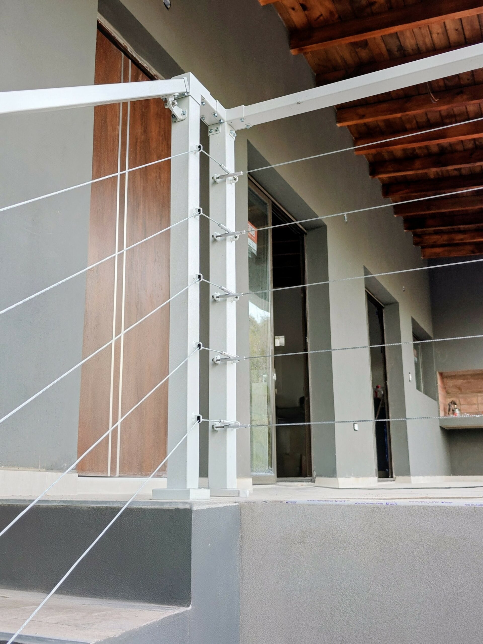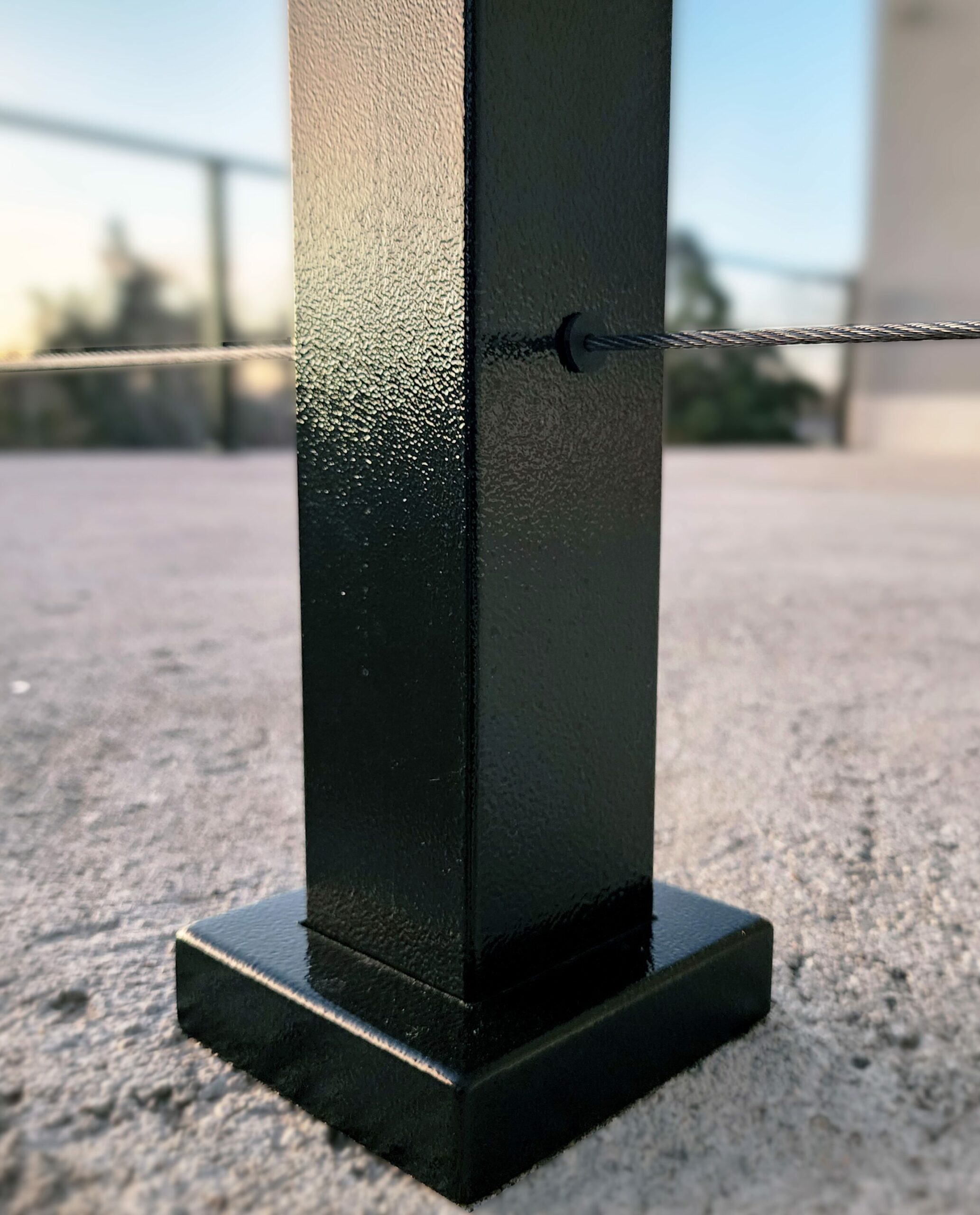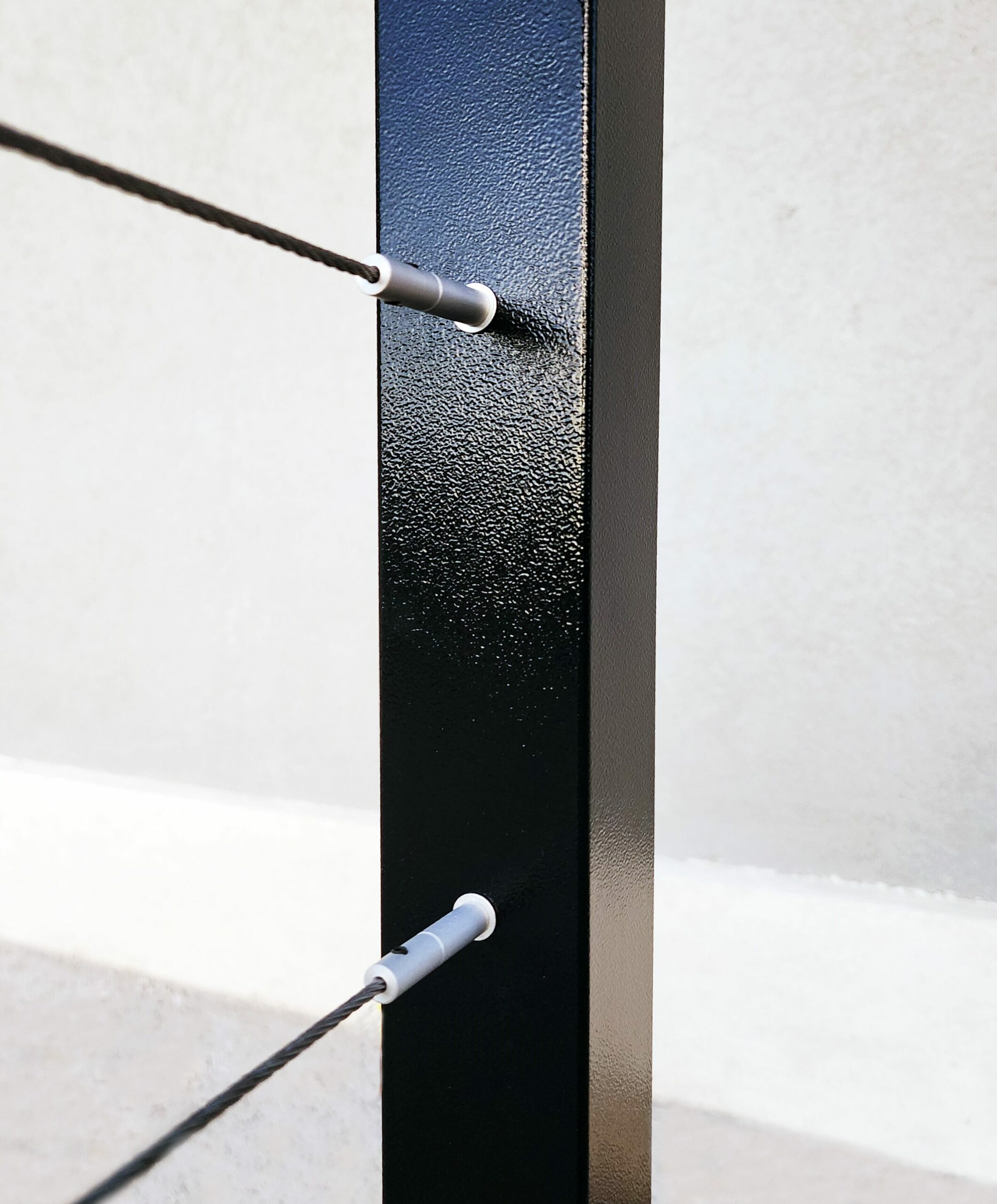 El sistema de cable de acero es el primer lanzamiento: columnas/postes estándar con bases para abulonar y cobertores estéticos; pasamanos y cables ajustables en obra con herramientas básicas (taladro, atornillador, amoladora). Todo llega listo para colocar, sin necesidad de pintura. Las piezas de acero se terminan con epoxi horneado de alta resistencia en cuatro colores estándar (negro, gris oscuro, gris claro, blanco); los tensores son de aluminio anodizado, la bulonería en inoxidable y el cable es galvanizado (con opción en inoxidable).