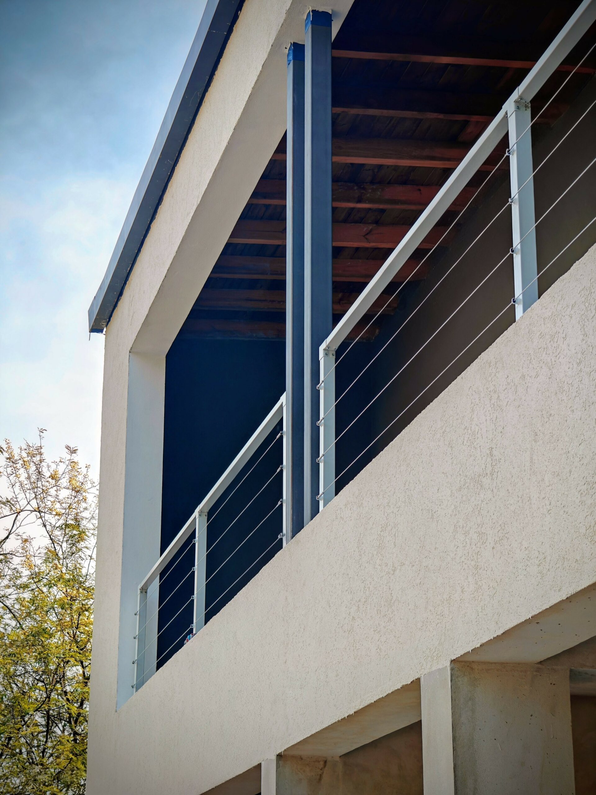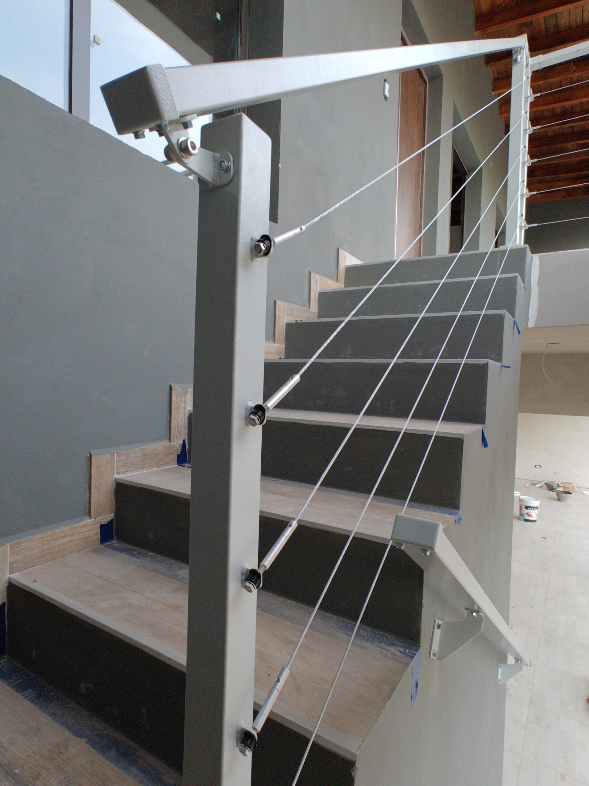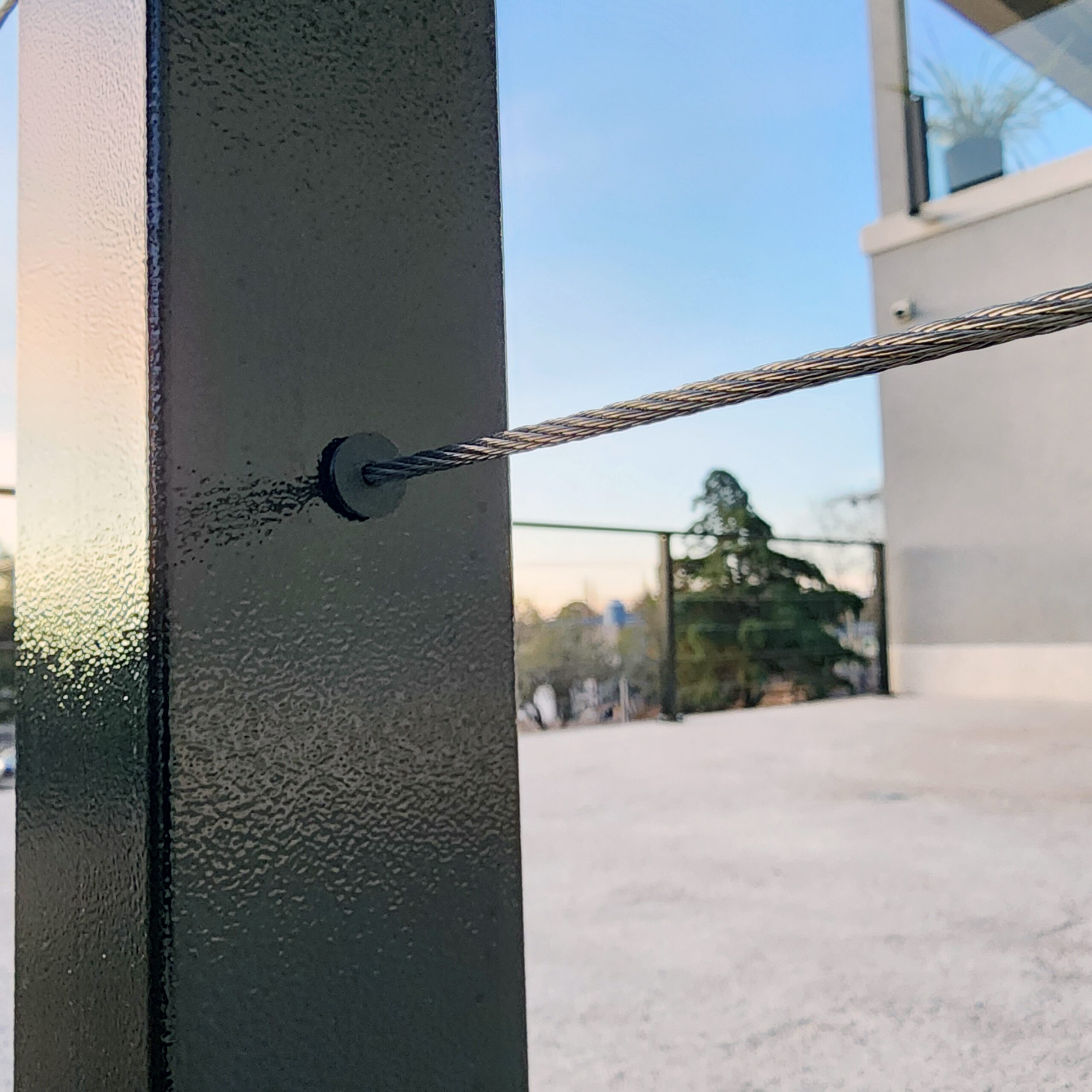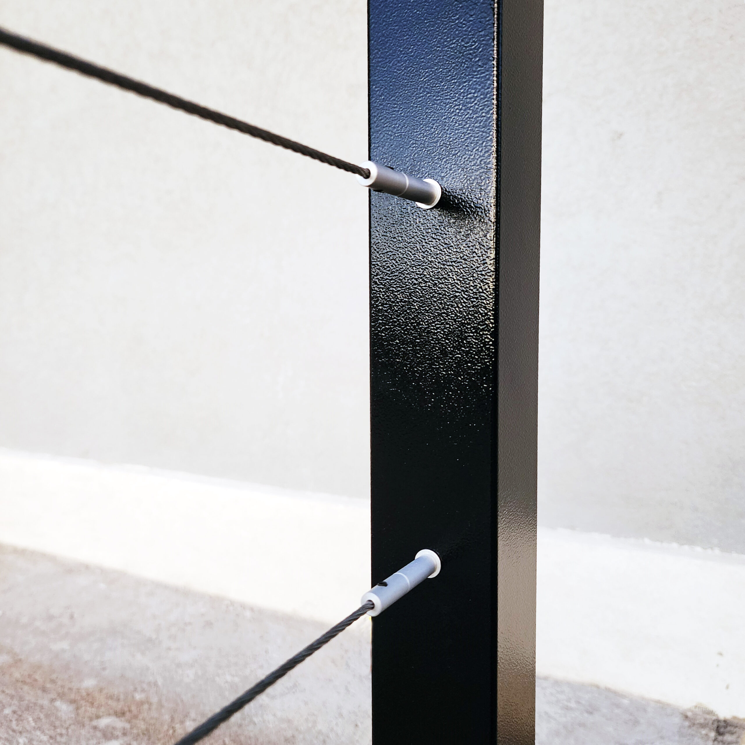 El sistema de cable de acero es el primer lanzamiento: columnas/postes estándar con bases para abulonar y cobertores estéticos; pasamanos y cables ajustables en obra con herramientas básicas (taladro, atornillador, amoladora). Todo llega listo para colocar, sin necesidad de pintura. Las piezas de acero se terminan con epoxi horneado de alta resistencia en cuatro colores estándar (negro, gris oscuro, gris claro, blanco); los tensores son de aluminio anodizado, la bulonería en inoxidable y el cable es galvanizado (con opción en inoxidable).
