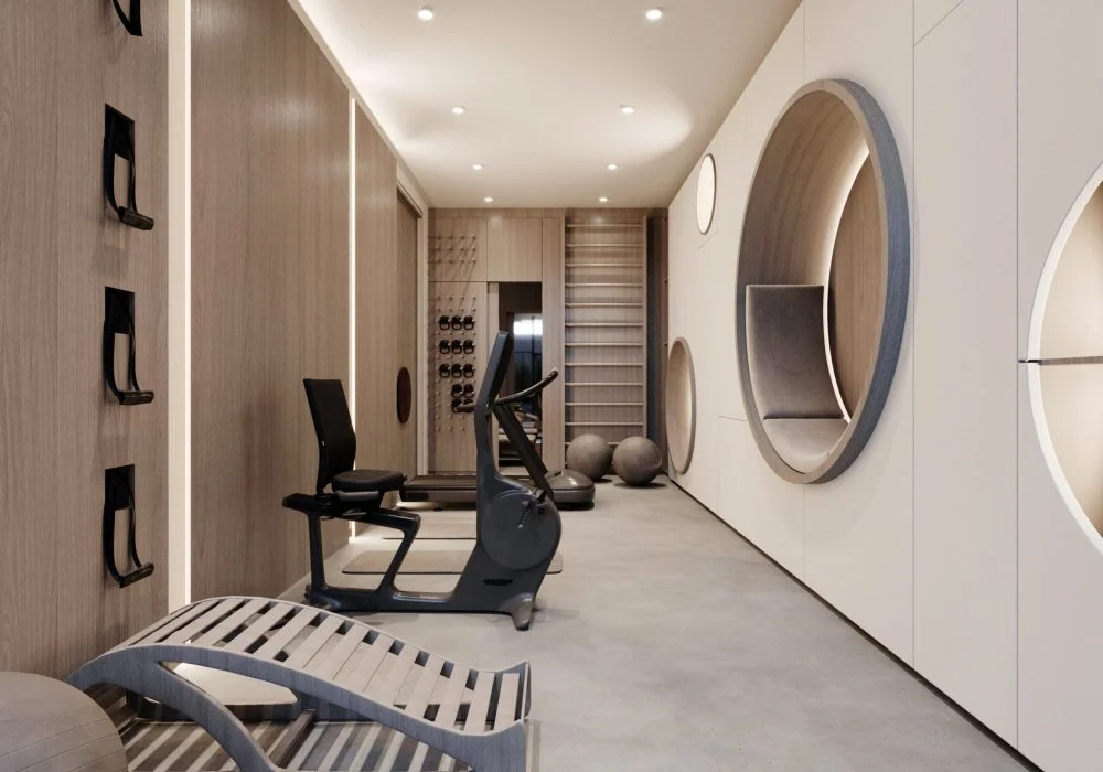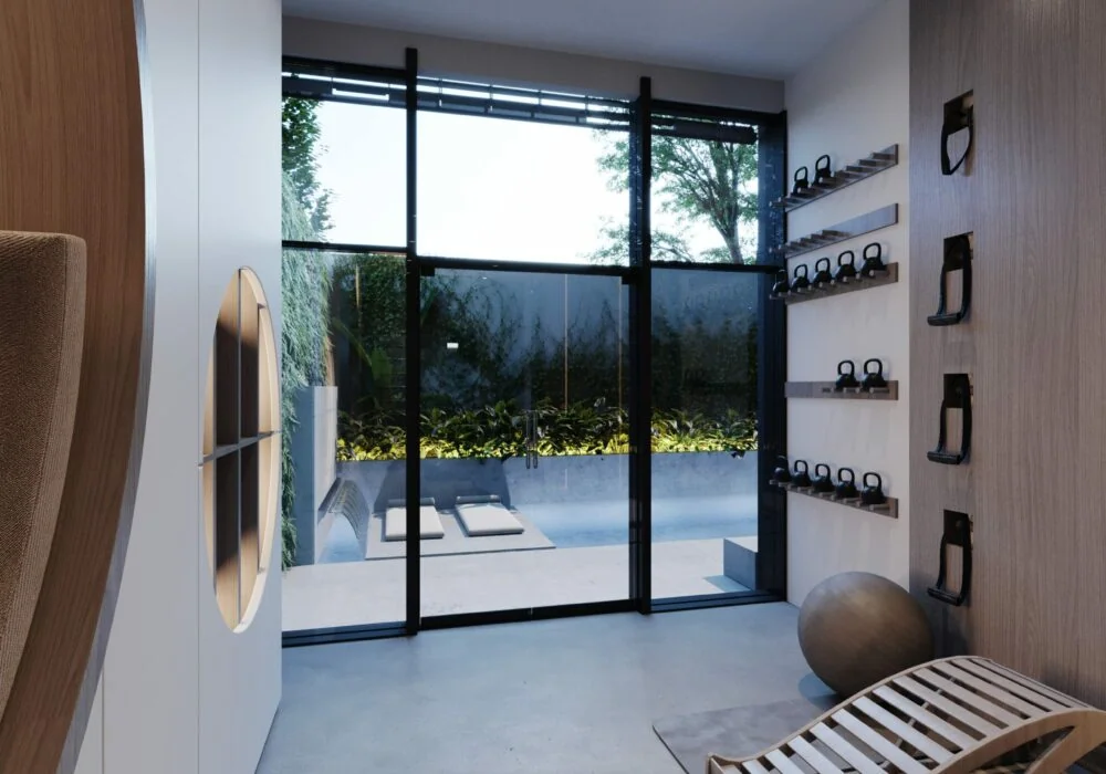 Área wellness: Un gimnasio convencional que también puede convertirse en un área de relajación con vista a la piscina con solarium y cascada.