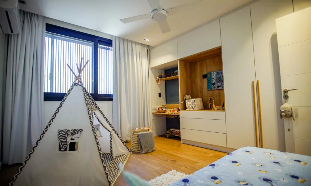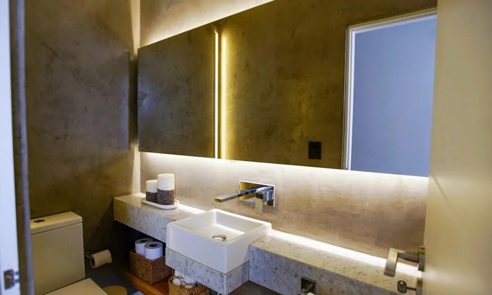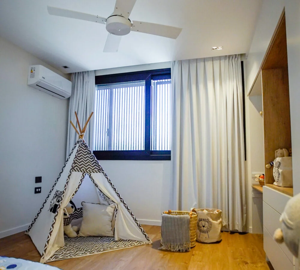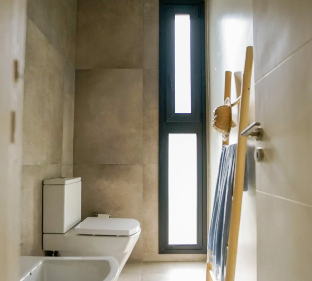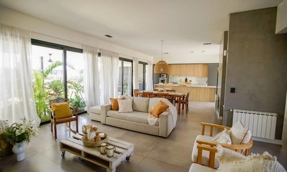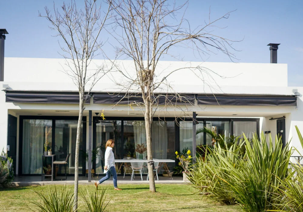 Estos vacíos actúan como transiciones entre los ambientes, creando juegos de luces y sombras que enriquecen la experiencia sensorial del recorrido interior. La vivienda se divide en dos sectores bien diferenciados: hacia la calle se ubican los dormitorios, mientras que en el fondo del lote se despliega el área social, vinculada a una amplia galería y al parque.