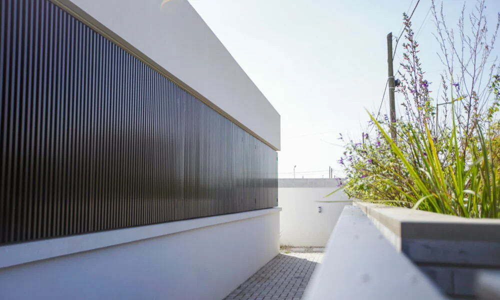 Desde una perspectiva tectónica, Casa Antón se define por tres líneas horizontales que organizan su fachada. La primera es un muro-cantero que delimita el contacto con la calle, estableciendo un umbral de privacidad. La segunda, un cerramiento de parasoles que tamiza la luz y resguarda los dormitorios. Finalmente, una viga-cinta enmarca y recorre la vivienda, otorgándole identidad y cohesión formal.