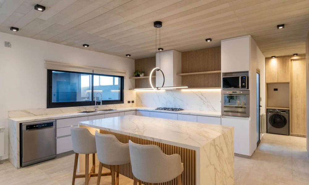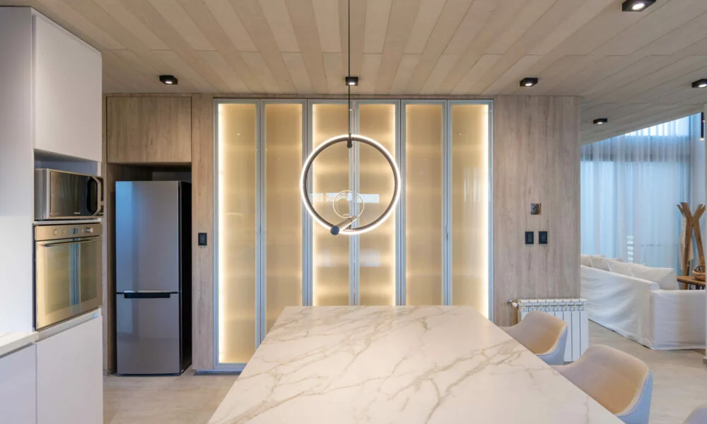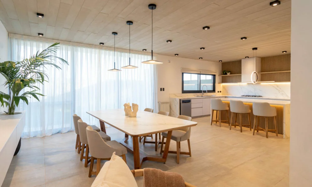 El núcleo de la Casa Buso es su cocina-comedor y el estar, diseñados bajo un concepto abierto que fomenta la convivencia y la interacción. Este espacio central se caracteriza por una doble altura que acentúa la sensación de amplitud y luminosidad. Las grandes ventanas de pared a pared permiten que la luz natural inunde el área, creando un ambiente cálido y acogedor ideal para reuniones familiares y sociales.
