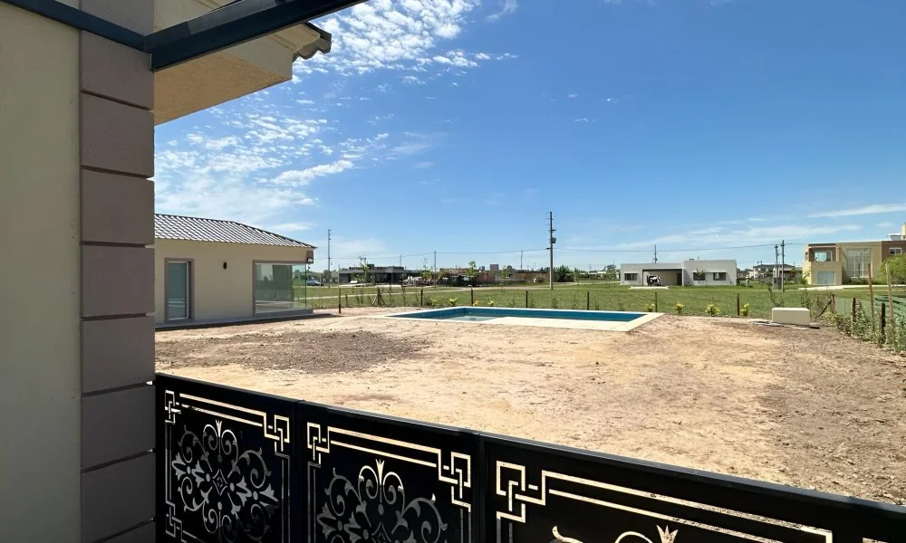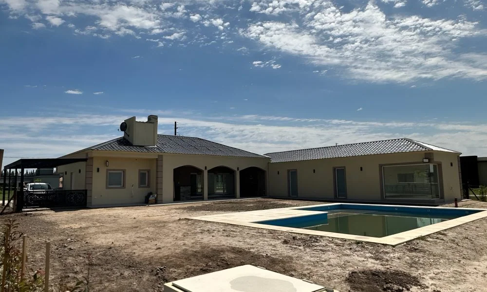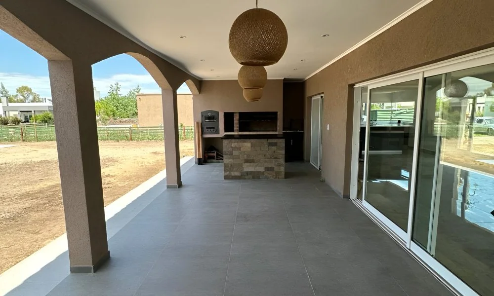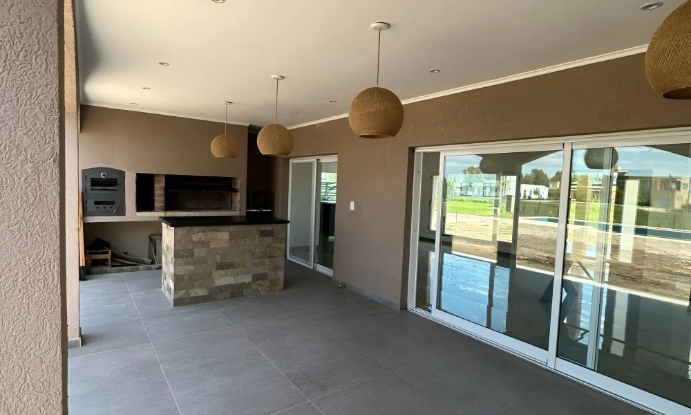 El área público-social, concebida como un espacio abierto que incorpora cocina, comedor y sala de estar, se conecta visualmente con la galería semicubierta y la parrilla a través de amplios ventanales. Desde estos espacios, se accede a una piscina de 52 m2, donde el agua refleja estratégicamente la arquitectura circundante, demostrando una cuidadosa planificación y diseño.