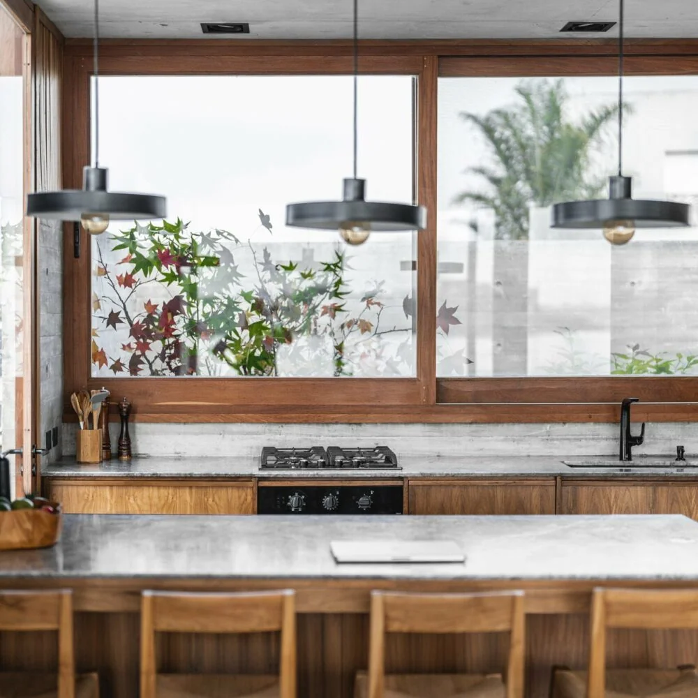 La orientación de los ambientes principales hacia el norte, con grandes aleros que regulan la luz solar según las estaciones, junto con los locales húmedos orientados al sur, aseguran una iluminación y ventilación natural óptimas. Los patios actúan como pulmones verdes que permiten la circulación de aire cruzada, creando una arquitectura consciente y en constante contacto con la naturaleza.