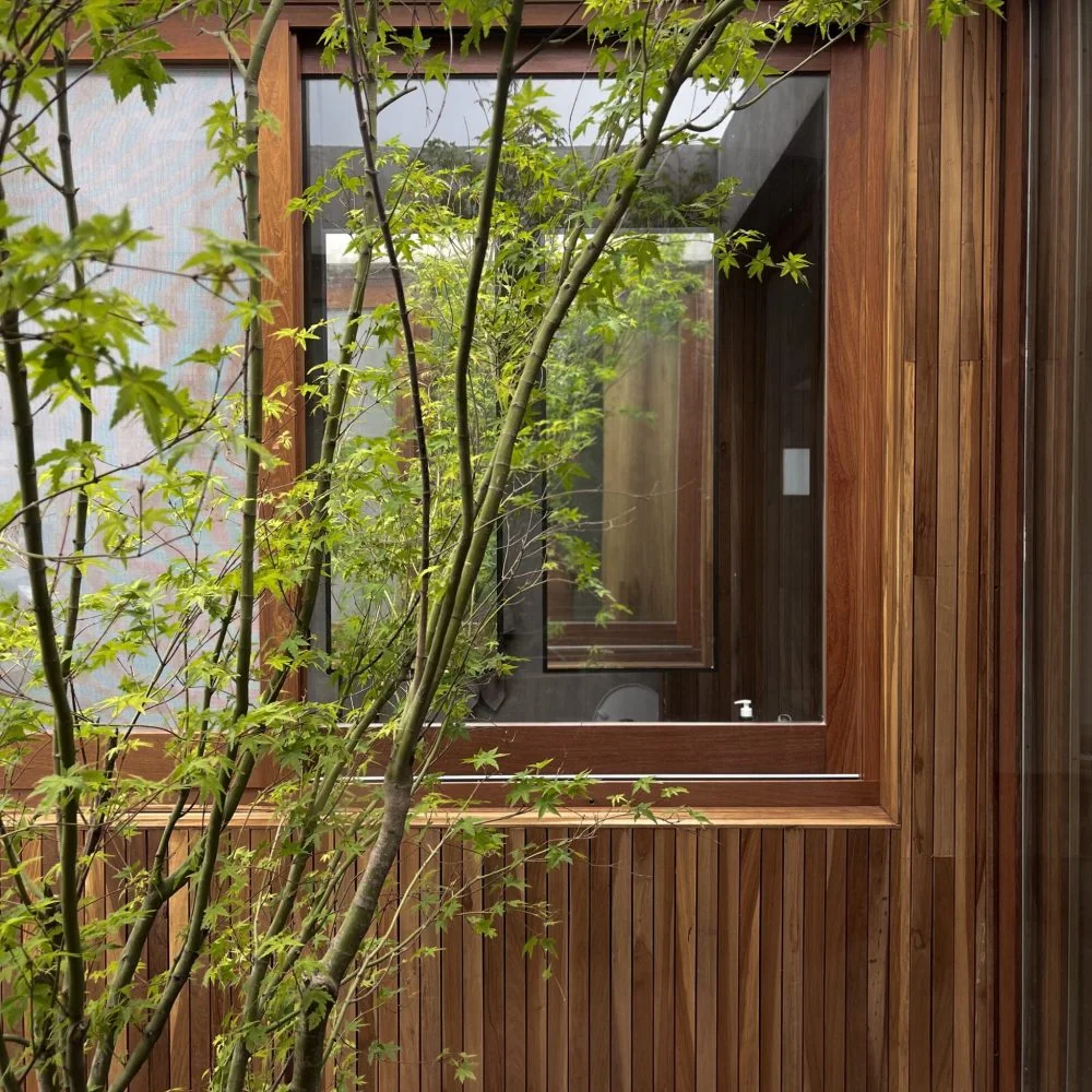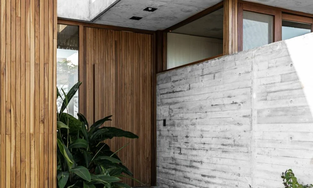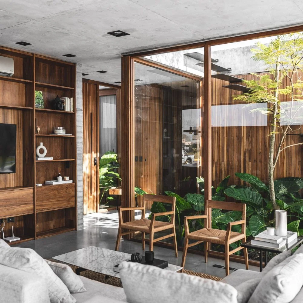 La elección de materiales es clave para la estética y la funcionalidad de la casa. Revestimientos y aberturas de madera de lapacho macizo nativo crean un ambiente acogedor, aludiendo a la idea de nidos que inspira todo el proyecto.