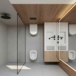El antiguo núcleo de escalera al sótano se reconvierte en estantes curvos para accesorios. Tras el arco contenedor aparece el ámbito de probadores: un espejo de fondo, una pastilla baja que eleva al cliente y un aro de luz suspendido que subraya la escena. El ingreso de servicio sobre Pueyrredón –exclusivo del personal– se protege con un biombo curvo y móvil, recurso que también oculta la puerta del depósito.