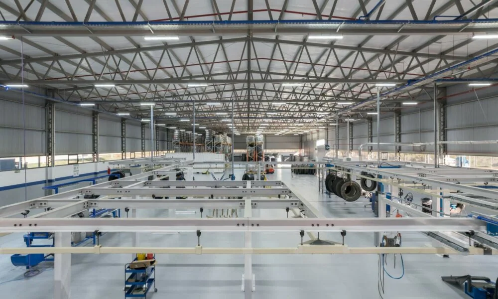 El proyecto, que representa un gran desafío para el estudio, se materializa a través de dos naves longitudinales conectadas y posicionadas paralelamente. La nave principal, de 25 m de ancho, 78 m de largo y 6 m de altura libre, alberga todo el layout industrial productivo y fabril, complementado por una amplia playa de maniobra para vehículos de gran porte, optimizando así el proceso productivo y logístico de la empresa.