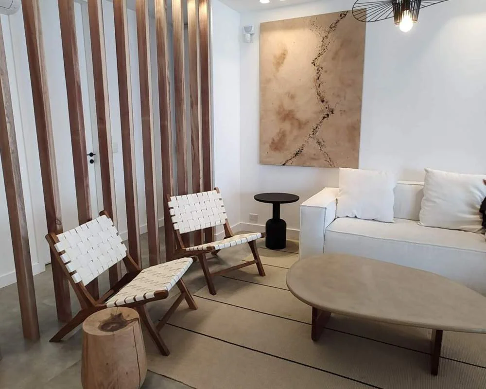 Los colores neutros, como gris, marrón, negro y blanco, sirven como lienzo para resaltar la belleza natural que rodea al departamento. Estos tonos crean un ambiente sereno y relajante, permitiendo que las vistas al mar sean el foco principal del espacio. El uso de un verde musgo natural en la cocina añade frescura y vitalidad, recordando la vegetación costera.