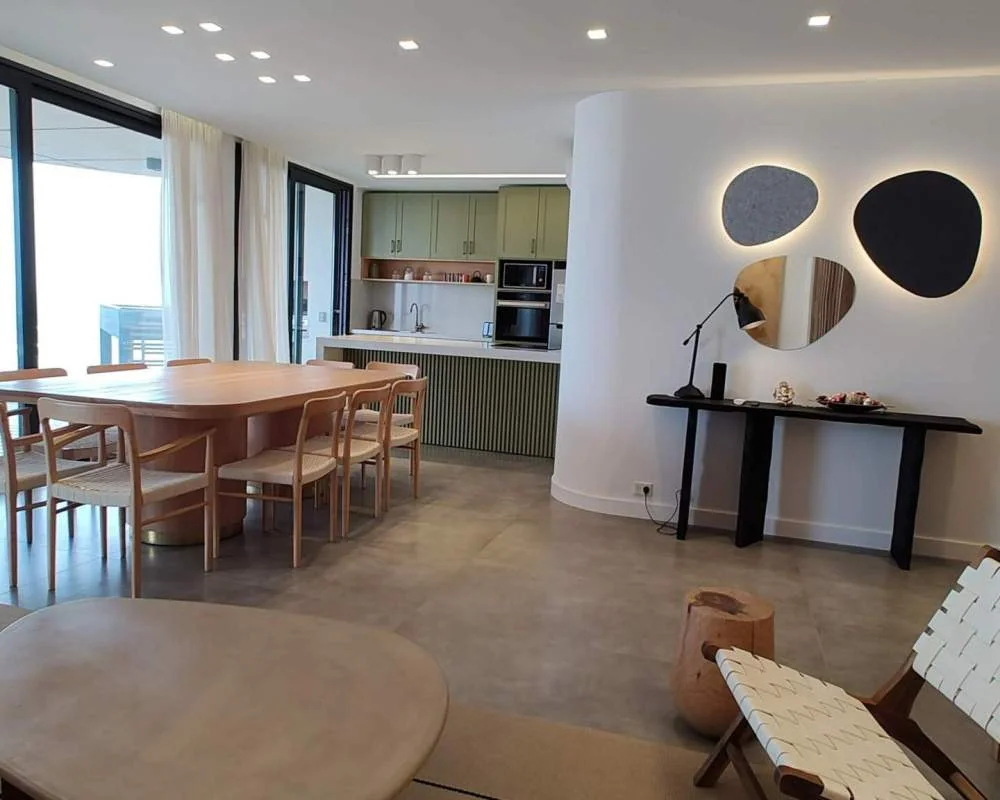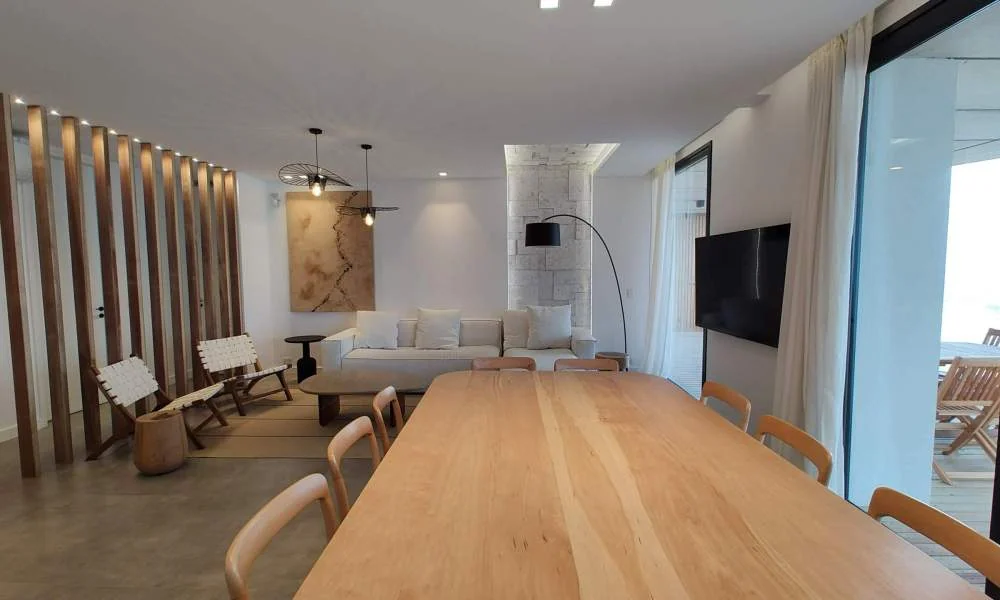 El diseño lumínico juega un papel fundamental en la creación de atmósferas cambiantes que se adaptan a las distintas horas del día y las necesidades de los residentes. Se han implementado diversas opciones de iluminación, desde luces empotradas en el techo hasta lámparas de pie estratégicamente ubicadas, permitiendo controlar la intensidad y el tono de la luz según el momento y la actividad. Durante el día, la luz natural inunda el espacio, realzando la sensación de apertura hacia el mar. Por la noche, las luces indirectas crean un ambiente acogedor y relajante, ideal para disfrutar de una cena frente al mar o de una velada tranquila en casa.