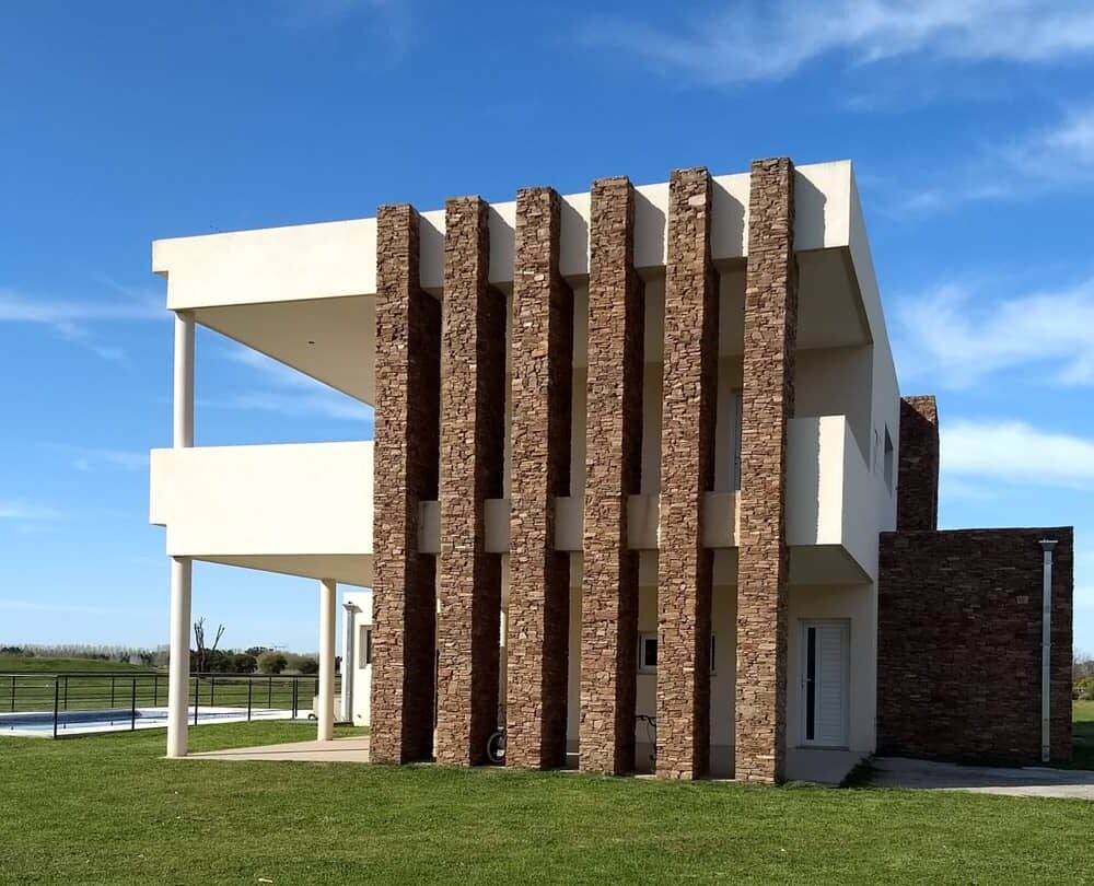 Proyecto y construcción del Arq. Pablo José Dayan (2016). Una casa de líneas puras y volúmenes bien definidos, implantada en un lote de 1.500 m² con vistas protagónicas a la cancha de golf. Superficie cubierta: 350 m². Superficie semicubierta: 100 m².